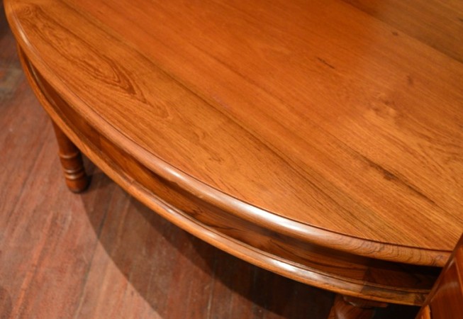 Beautiful grains and remarkable workmanship signify this piece. The grains on the table top are spectacular and the joinery work is all hand done. The legs are carved out of single blocks of wood. The size is neither too small nor too large.