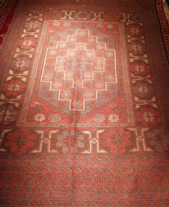 6′ x 9′ Approx. Masterfully hand woven kelim in brown and red threads with grey fields. Very beautiful.